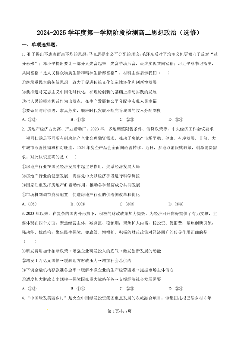 江苏省扬州中学2024-2025学年高二上学期12月月考政治(原卷版)