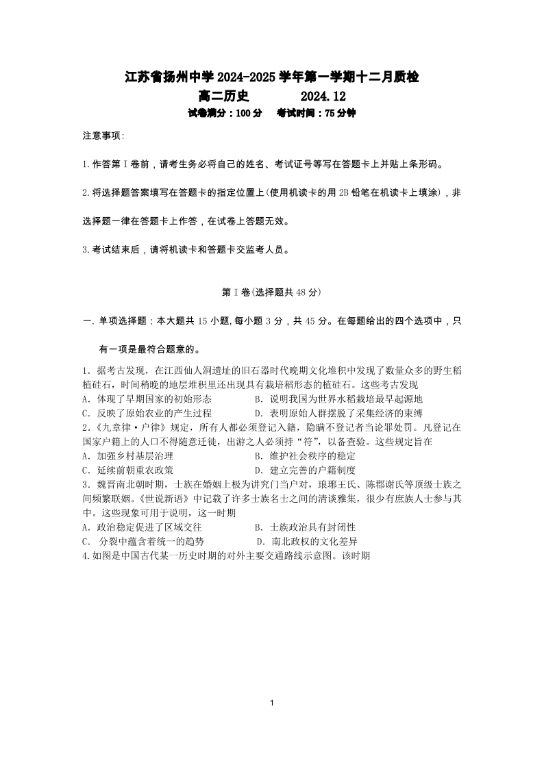 江苏省扬州中学2024-2025学年高二上学期12月月考历史+答案