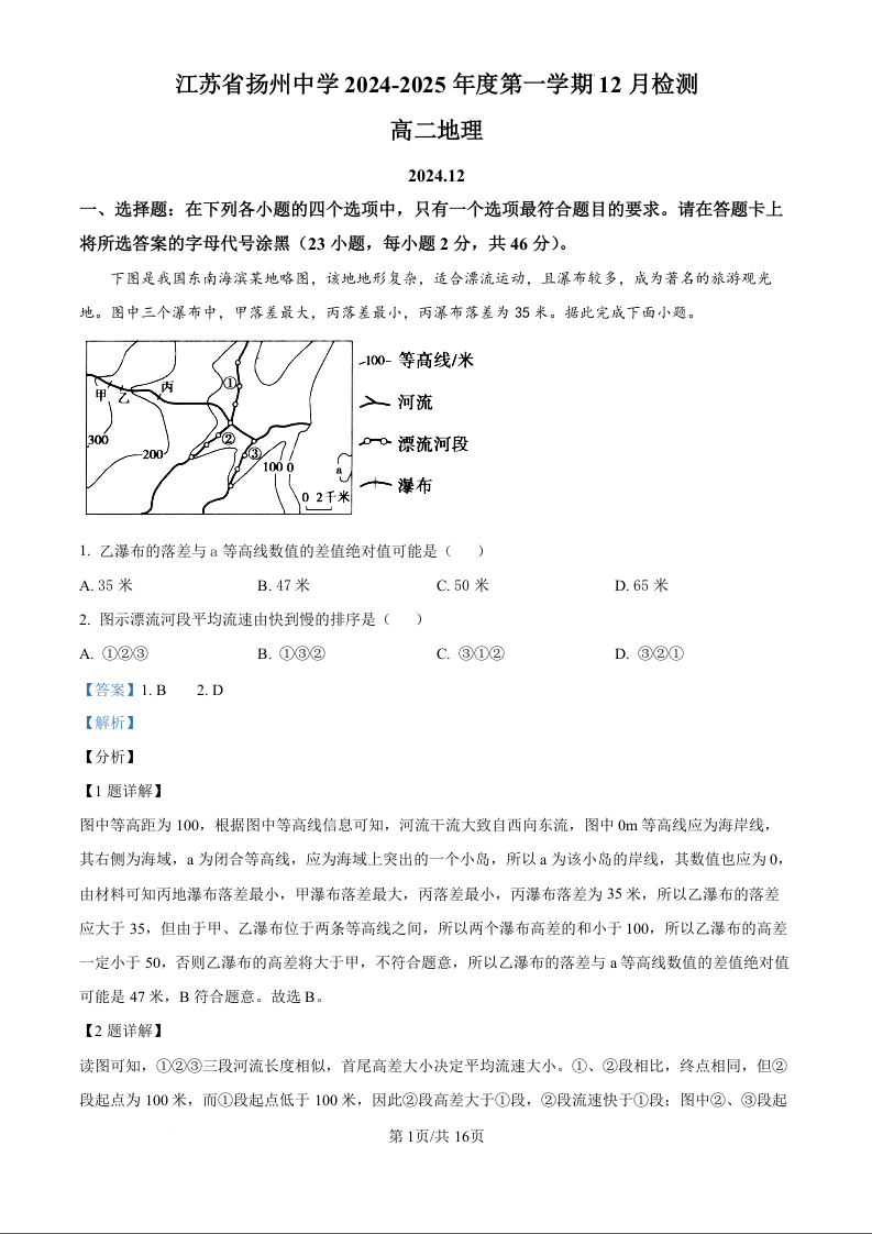 江苏省扬州中学2024-2025学年高二上学期12月月考地理(精品解析版)