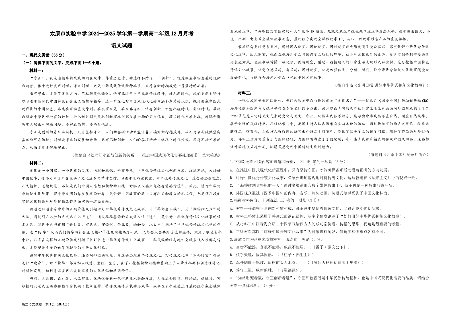 山西省太原市实验中学2024-2025学年高二上学期12月月考语文