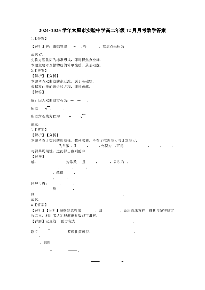 山西省太原市实验中学2024-2025学年高二上学期12月月考数学答案