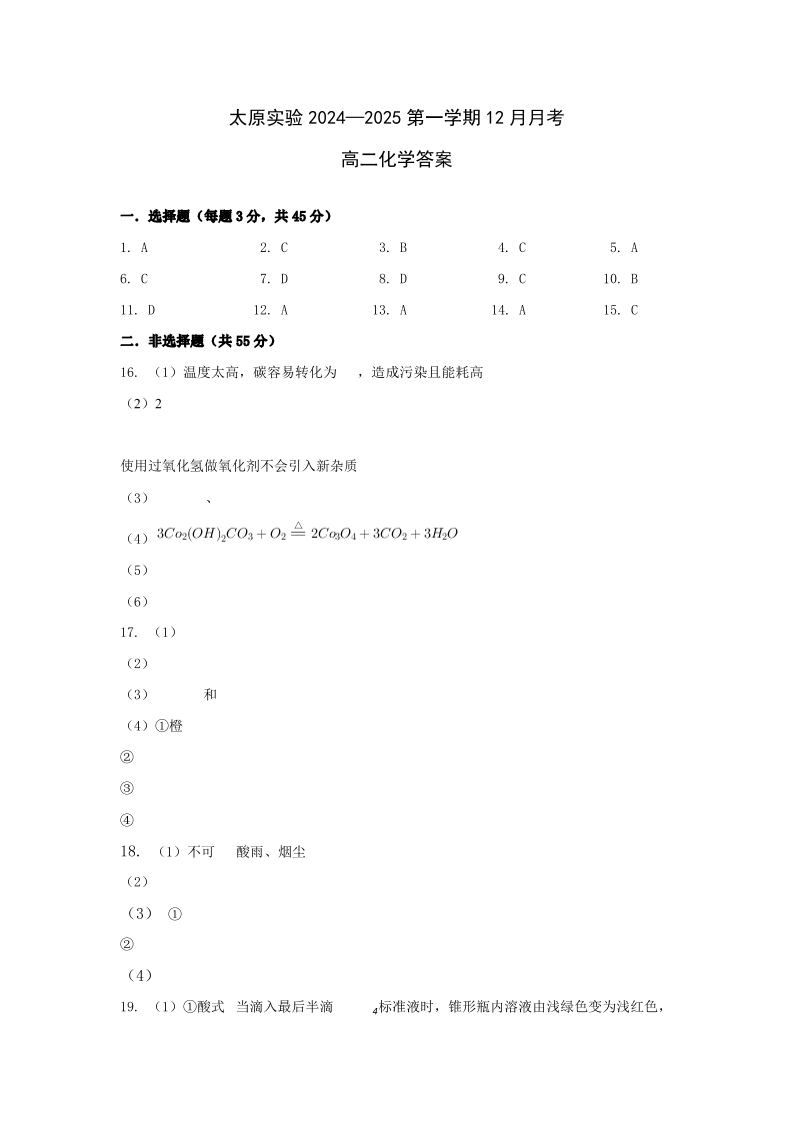 山西省太原市实验中学2024-2025学年高二上学期12月月考化学答案