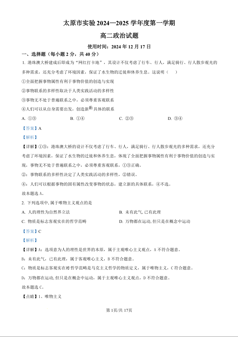 山西省太原市实验中学2024-2025学年高二上学期12月月考政治(精品解析版)