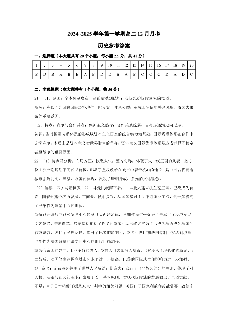 山西省太原市实验中学2024-2025学年高二上学期12月月考历史答案