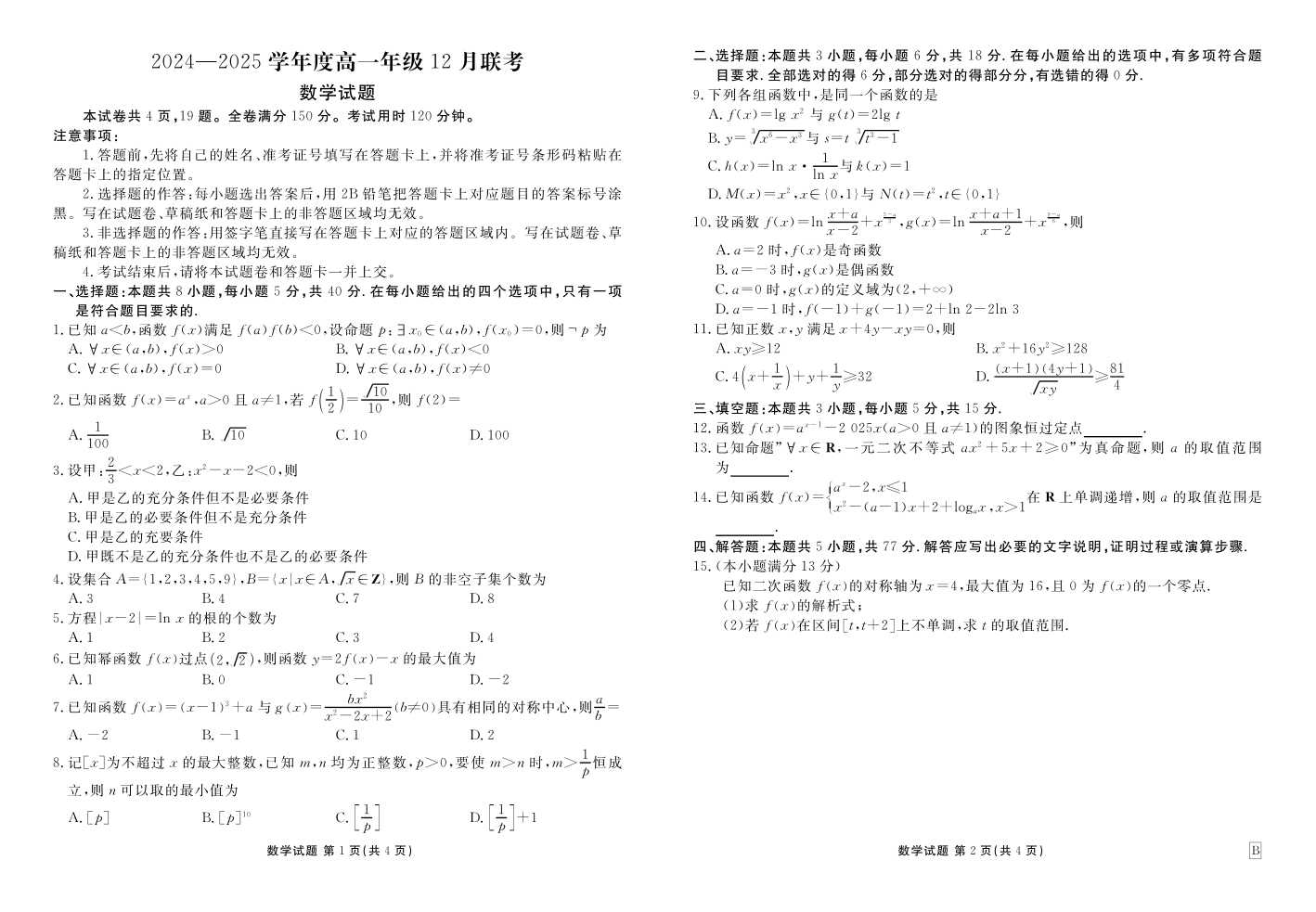 河北区域高中2024-2025学年度高一年级12 月联考数学B
