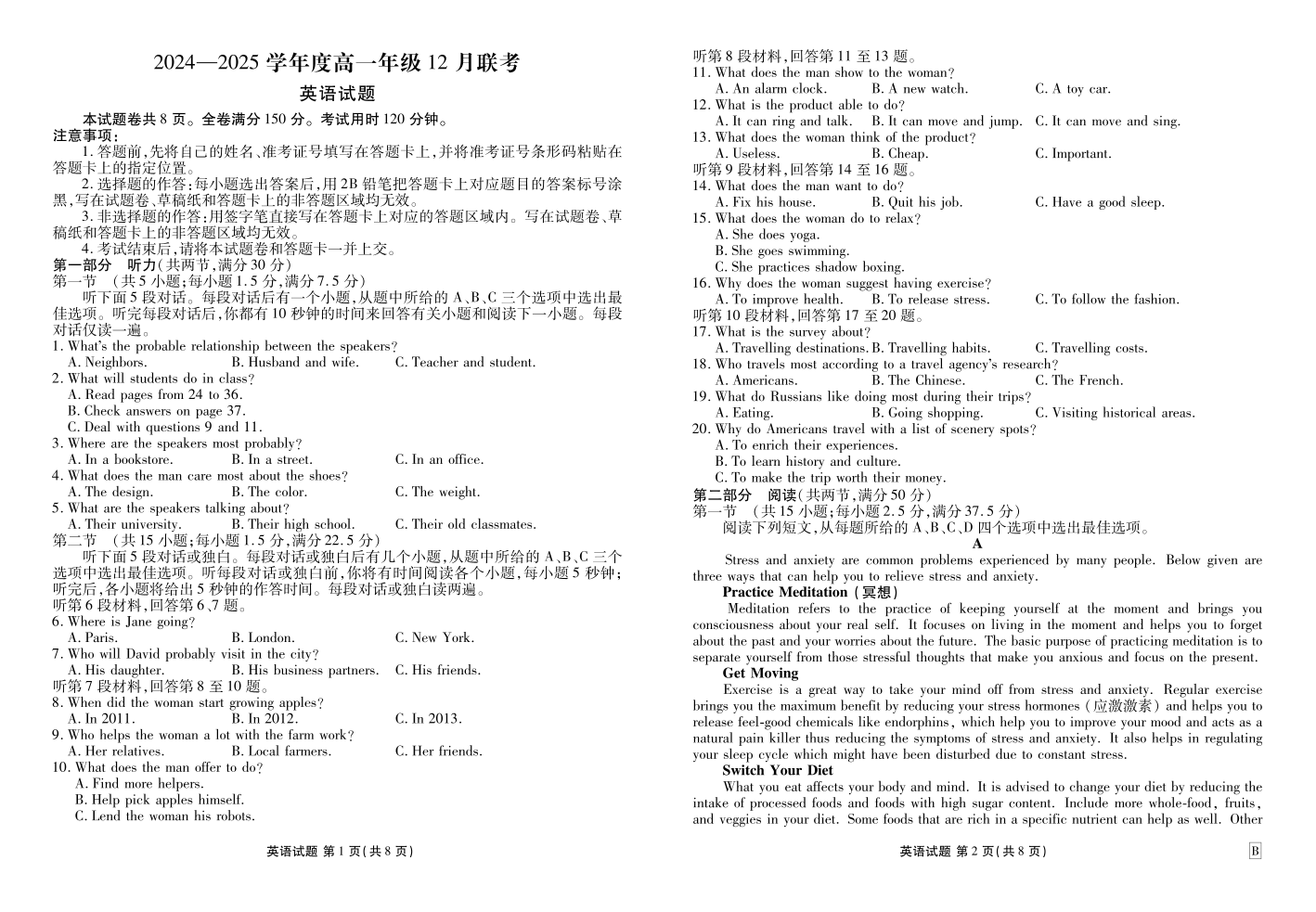 河北区域高中2024-2025学年度高一年级12 月联考英语B