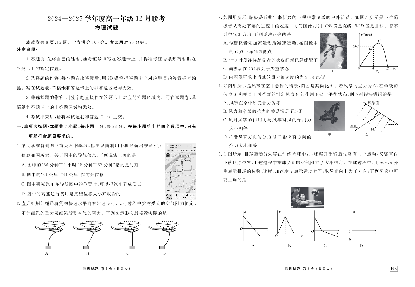 河北区域高中2024-2025学年度高一年级12 月联考物理