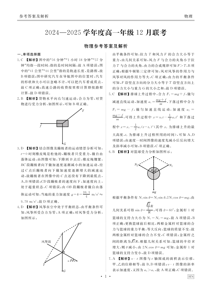 河北区域高中2024-2025学年度高一年级12 月联考物理答案