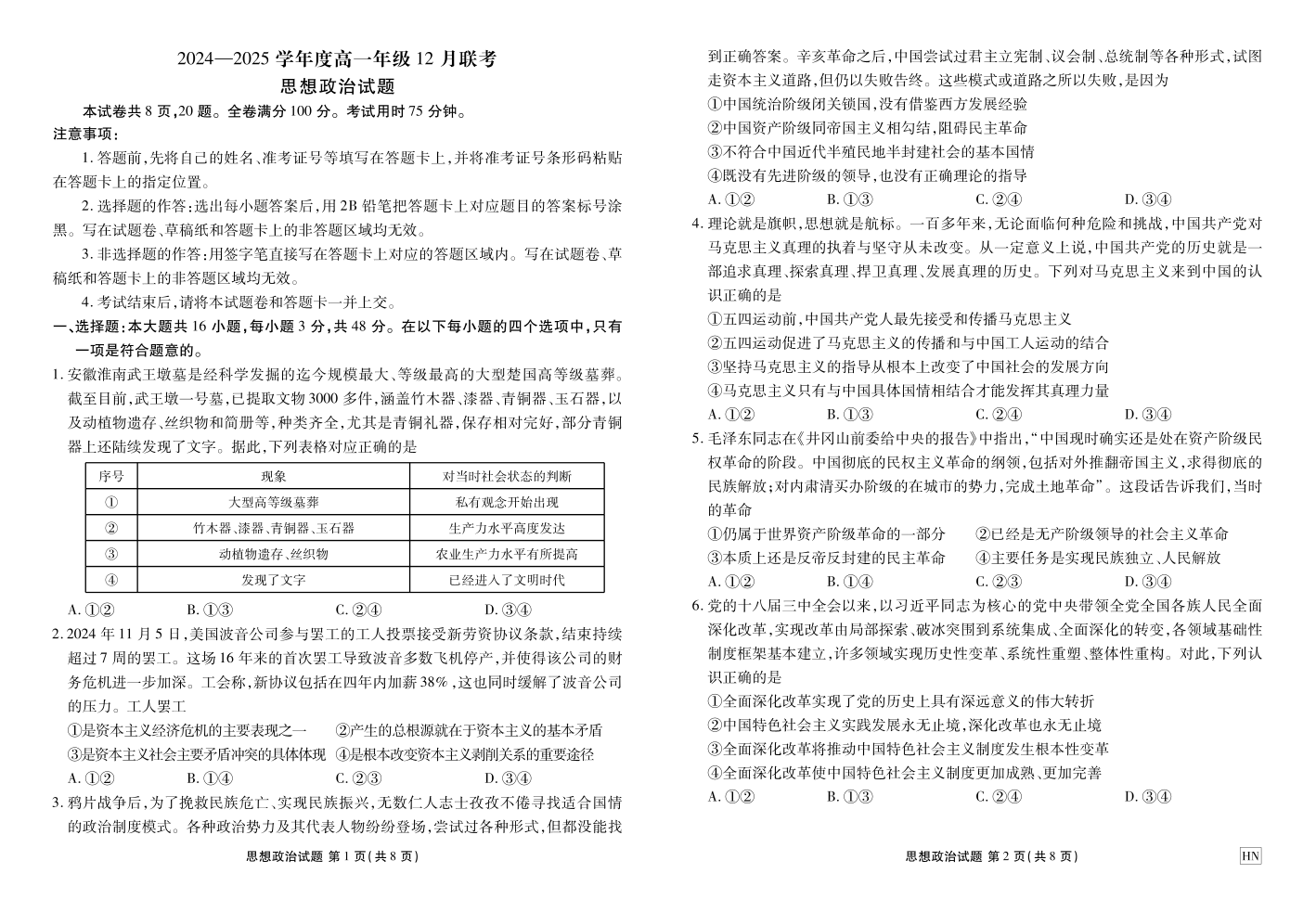 河北区域高中2024-2025学年度高一年级12 月联考政治