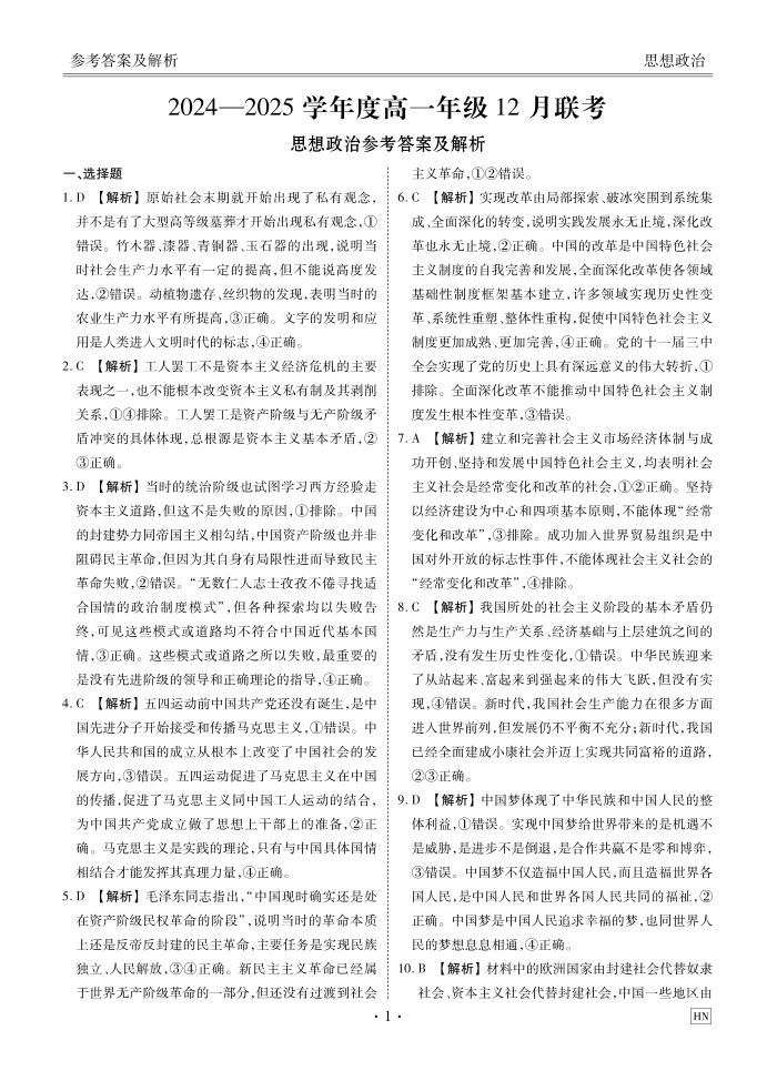 河北区域高中2024-2025学年度高一年级12 月联考政治答案