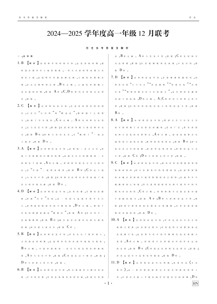 河北区域高中2024-2025学年度高一年级12 月联考历史答案