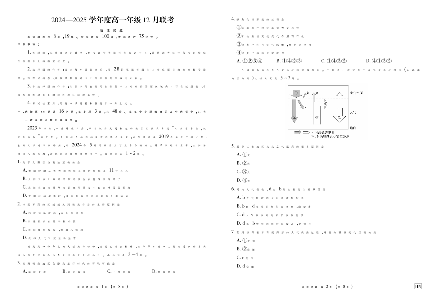 河北区域高中2024-2025学年度高一年级12 月联考地理