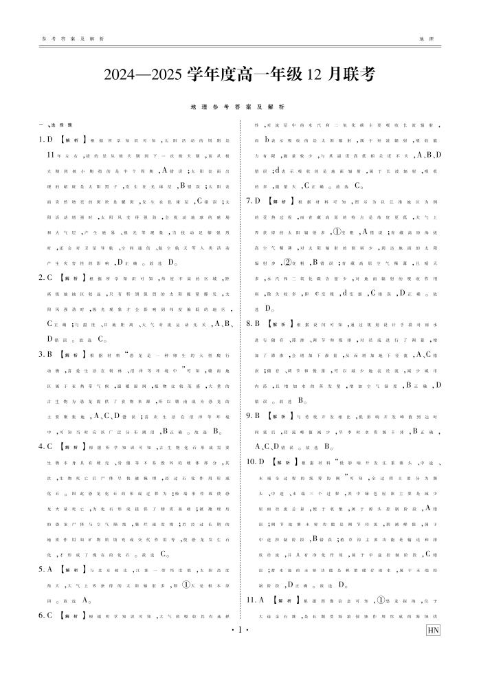河北区域高中2024-2025学年度高一年级12 月联考地理答案