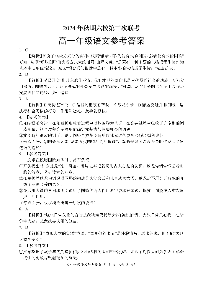 河南省南阳市六校2024年秋期高一年级第二次联考语文答案