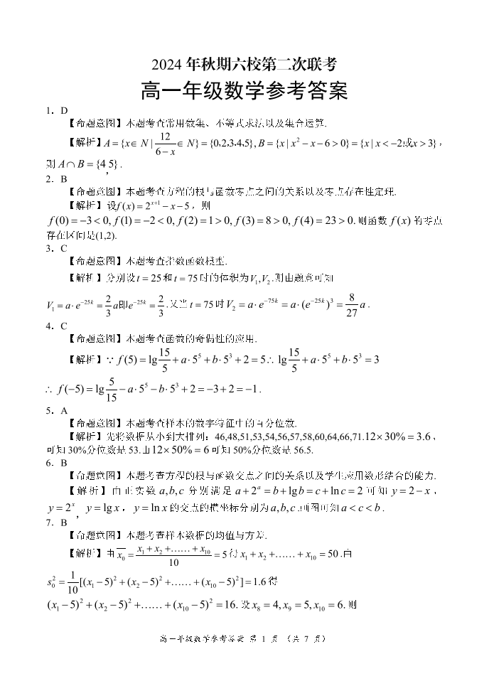 河南省南阳市六校2024年秋期高一年级第二次联考数学答案