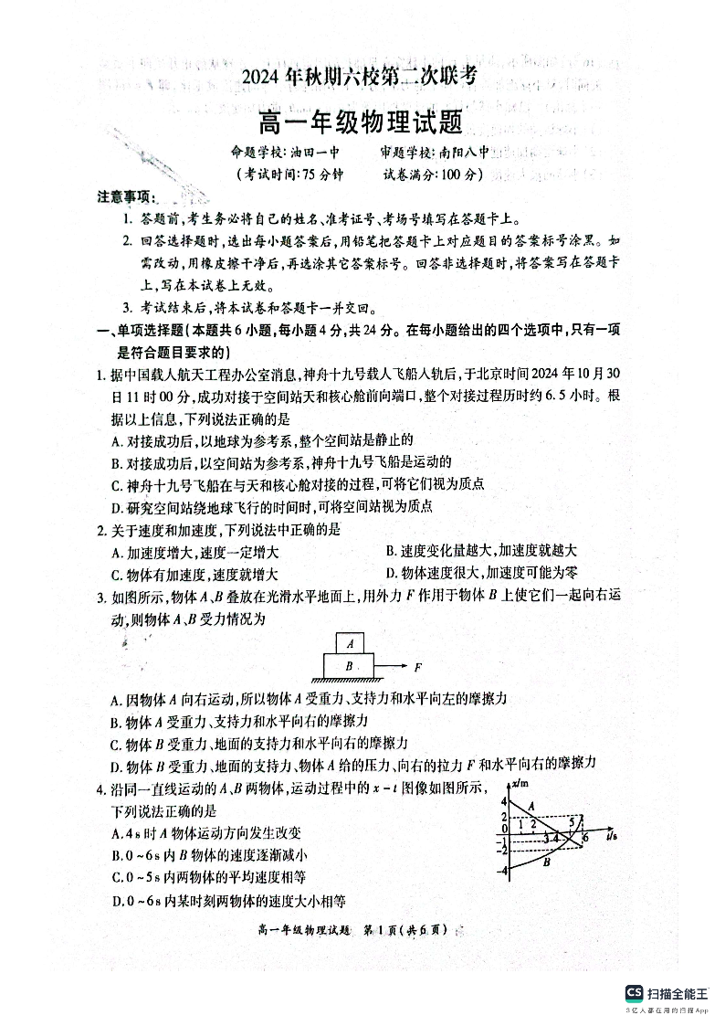 河南省南阳市六校2024年秋期高一年级第二次联考物理