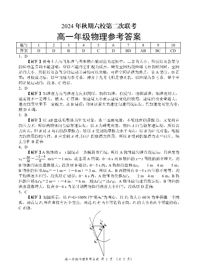 河南省南阳市六校2024年秋期高一年级第二次联考物理答案