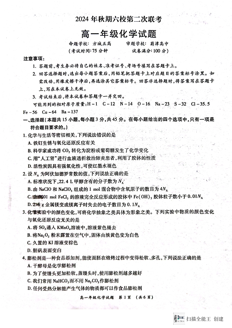 河南省南阳市六校2024年秋期高一年级第二次联考化学