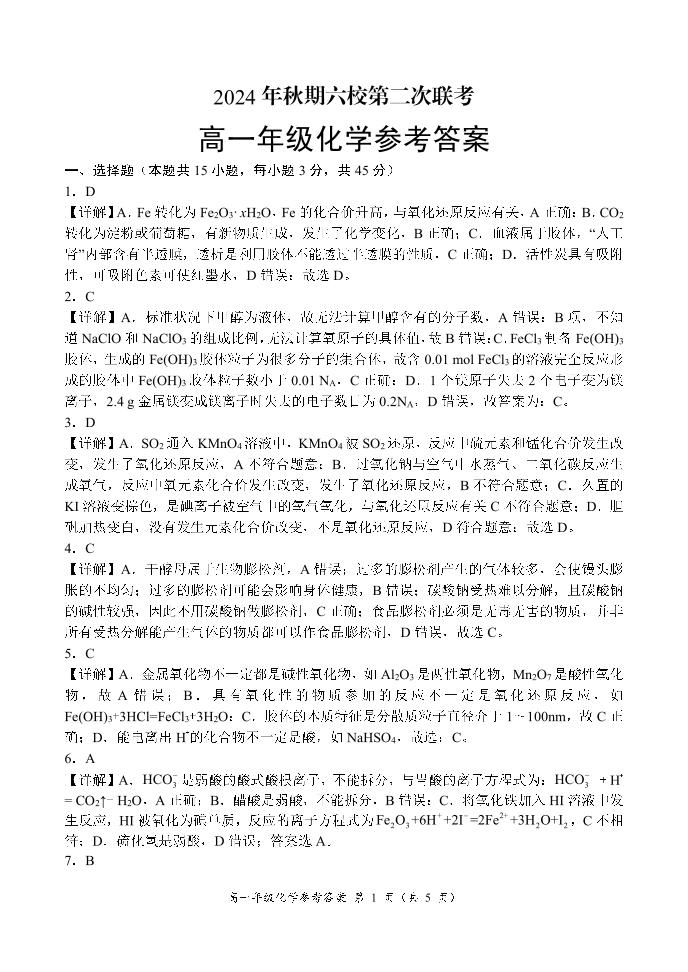 河南省南阳市六校2024年秋期高一年级第二次联考化学答案