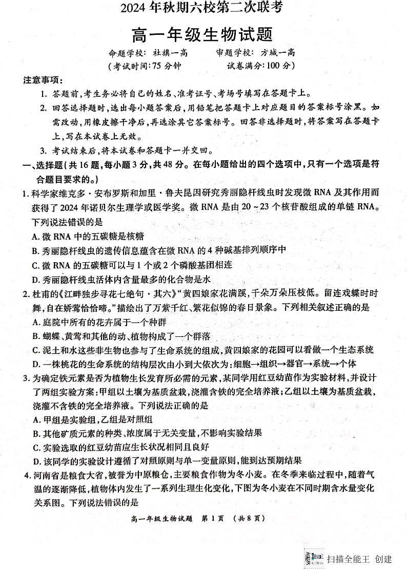 河南省南阳市六校2024年秋期高一年级第二次联考生物