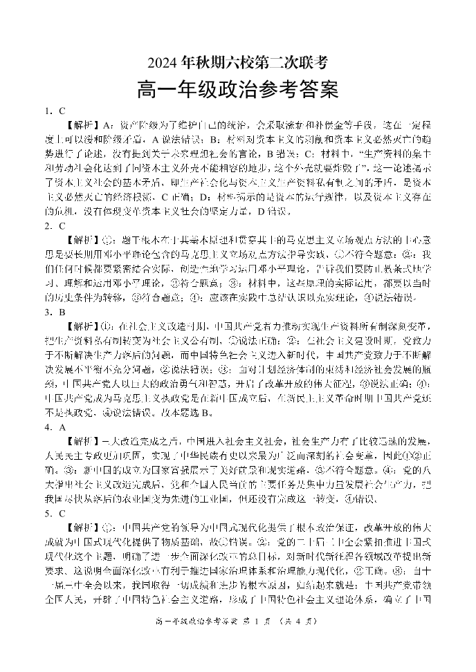 河南省南阳市六校2024年秋期高一年级第二次联考政治答案