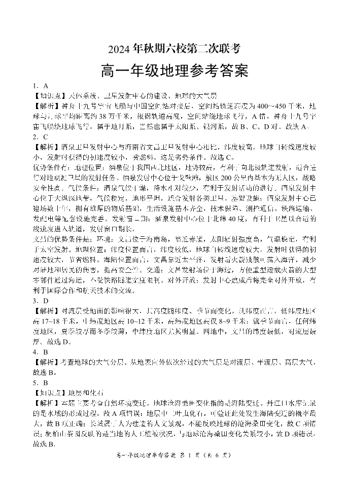 河南省南阳市六校2024年秋期高一年级第二次联考地理答案