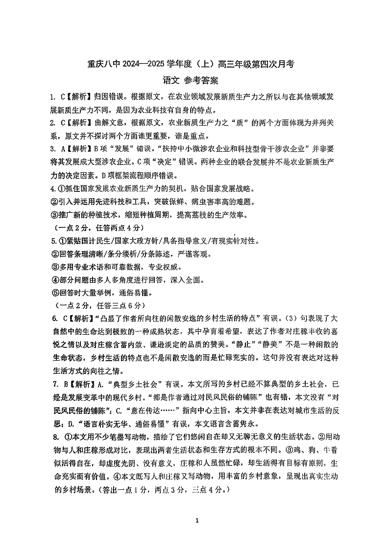 重庆市第八中学2025届高考高三适应性月考卷 (四)语文答案