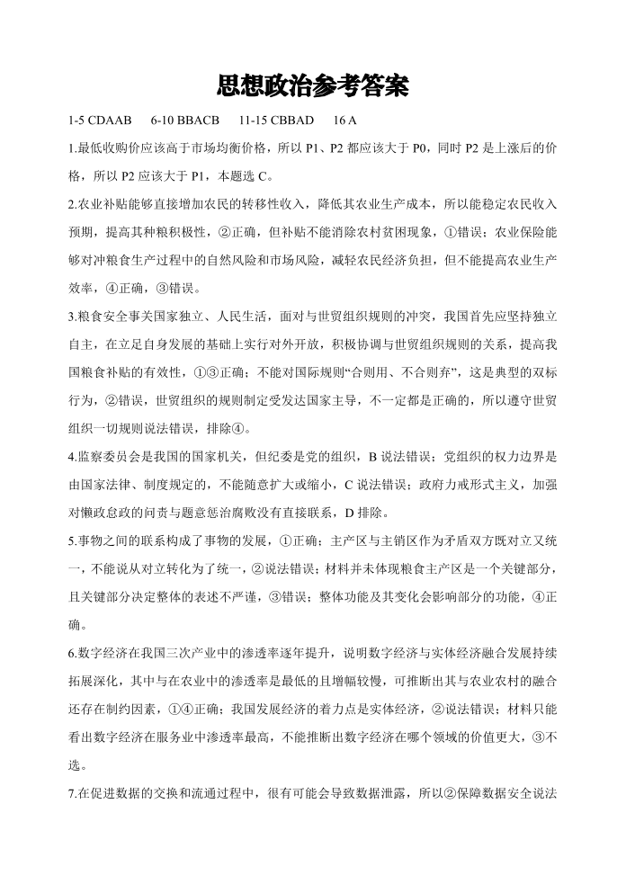 重庆市第八中学2025届高考高三适应性月考卷 (四)政治答案