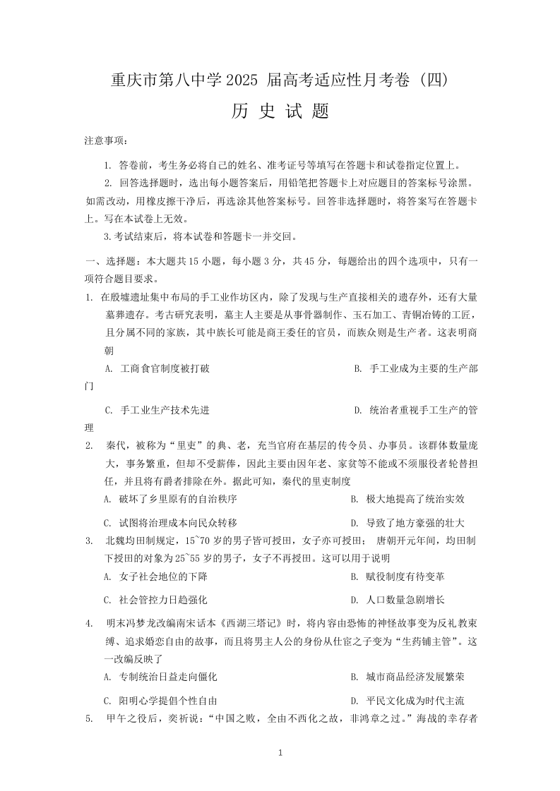 重庆市第八中学2025届高考高三适应性月考卷 (四)历史