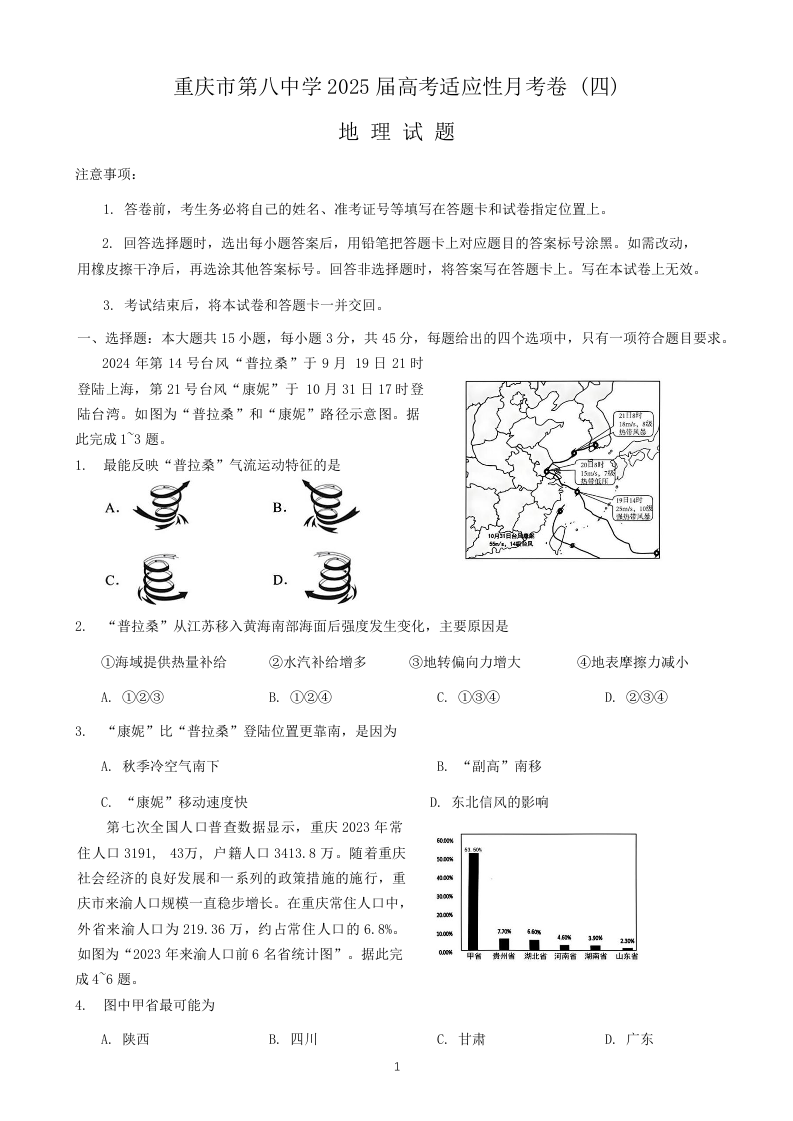重庆市第八中学2025届高考高三适应性月考卷 (四)地理
