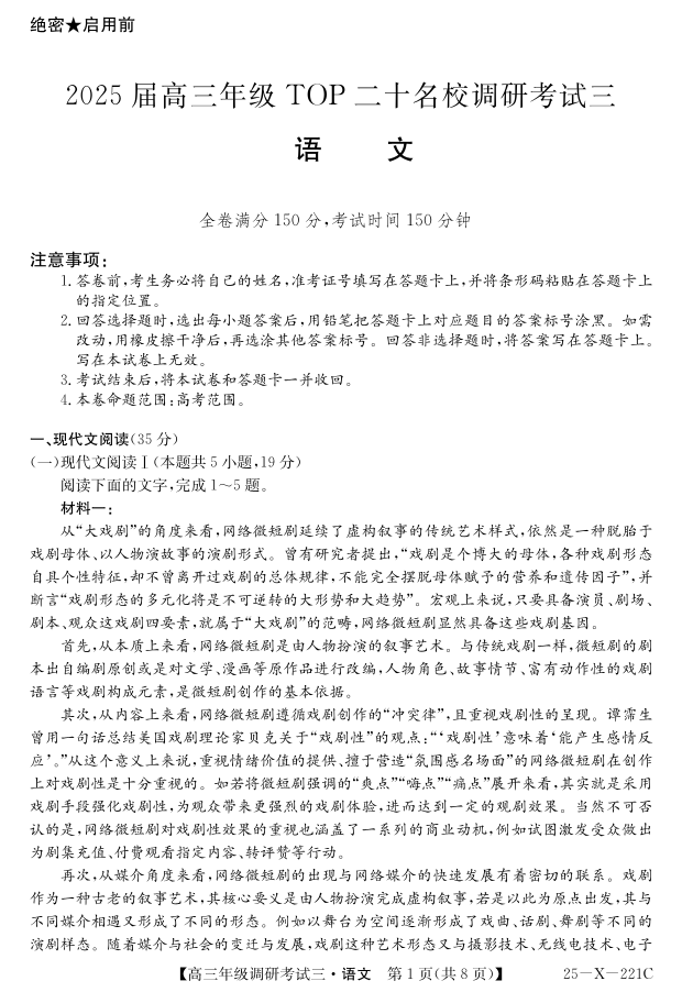 河南省TOP二十名校2025届高三上学期调研考试(三)语文