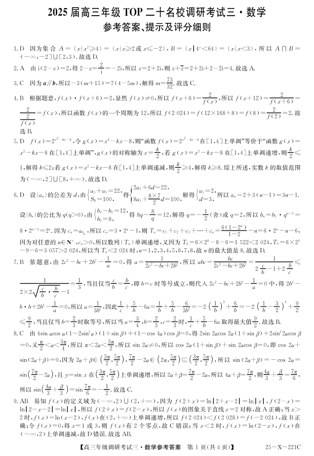 河南省TOP二十名校2025届高三上学期调研考试(三)数学答案