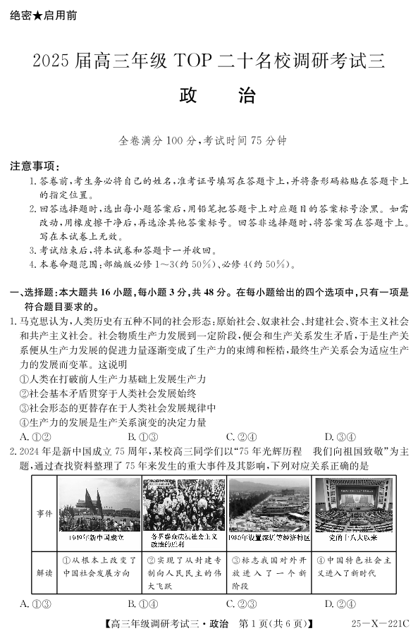 河南省TOP二十名校2025届高三上学期调研考试(三)政治