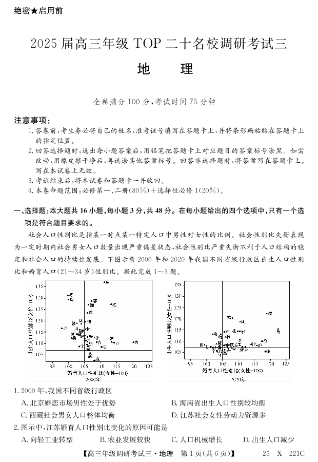 河南省TOP二十名校2025届高三上学期调研考试(三)地理