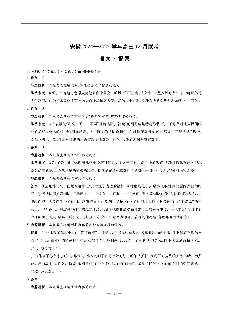 安徽省区域高中2025届上学期高三年级12月联考语文答案