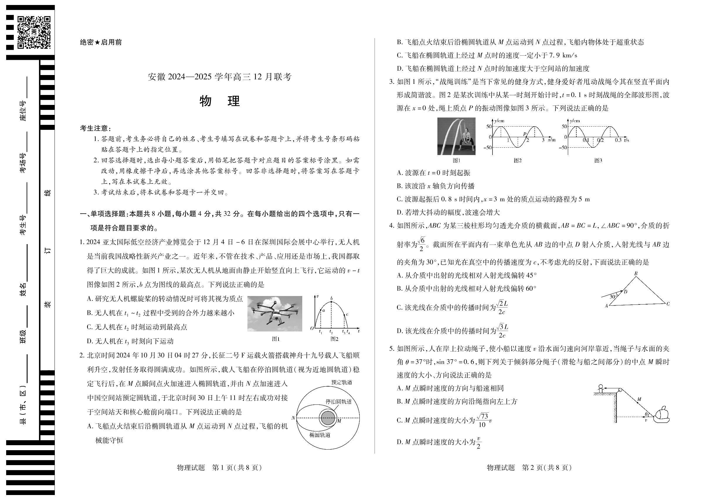 安徽省区域高中2025届上学期高三年级12月联考物理