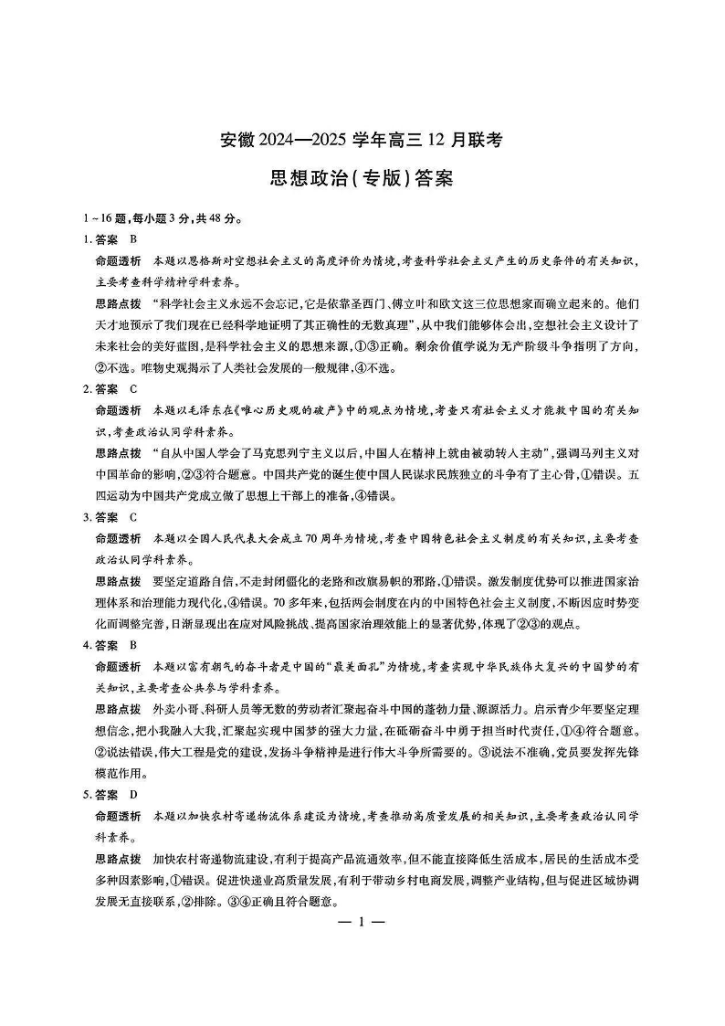 安徽省区域高中2025届上学期高三年级12月联考政治答案