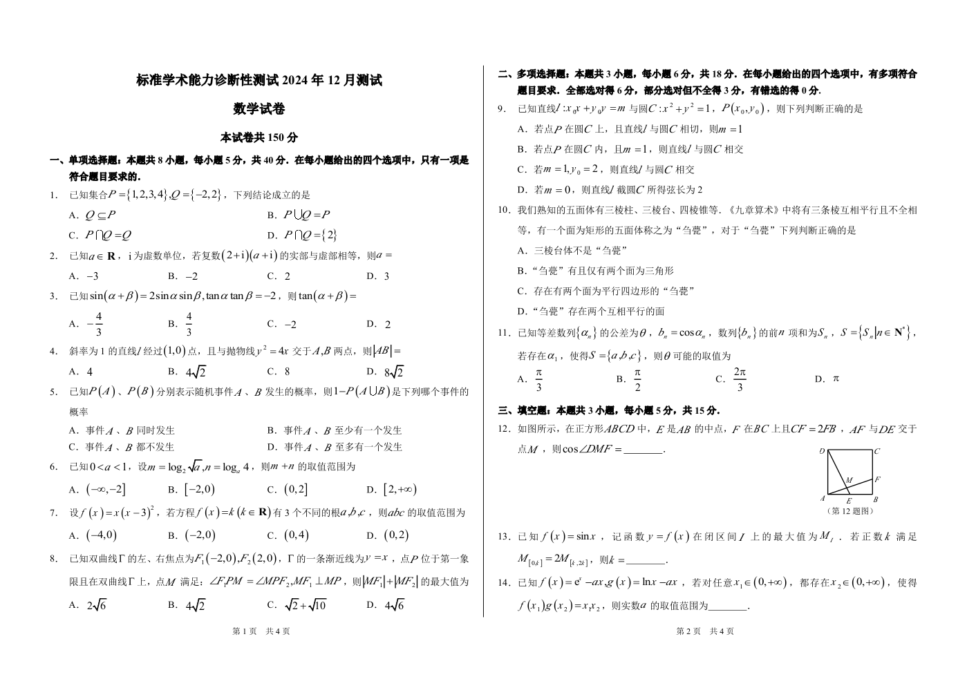 全国中学生标准学术能力诊断性测试2025届高三上学期12月月考数学+答案