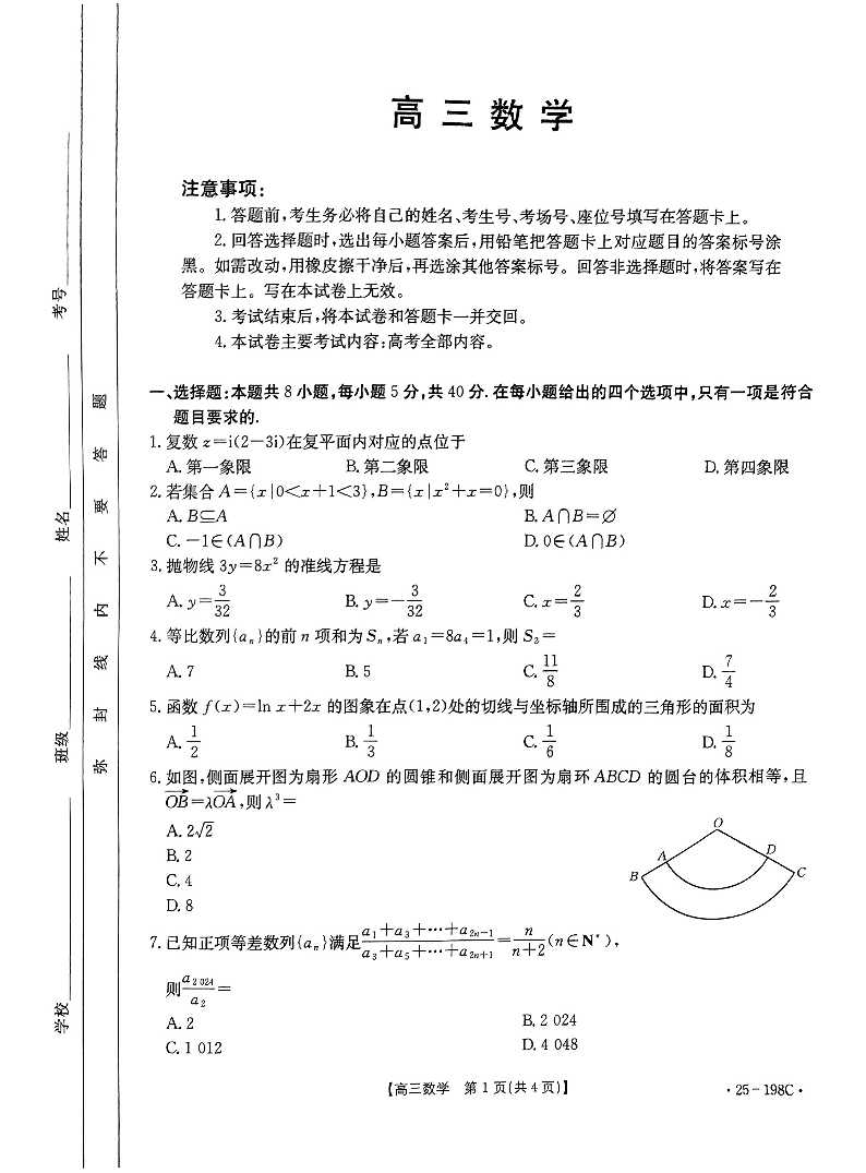 广东、福建两省跨区域高中2025届高三年级12月联考数学