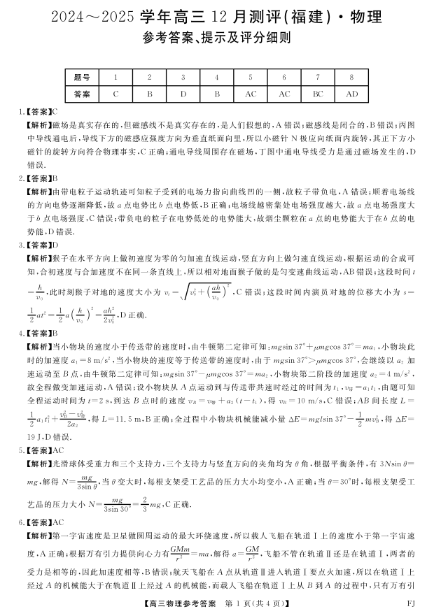 福建省金科大联考2025届上学期高三年级12月测评物理答案