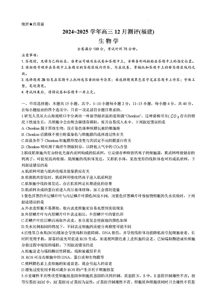 福建省金科大联考2025届上学期高三年级12月测评生物