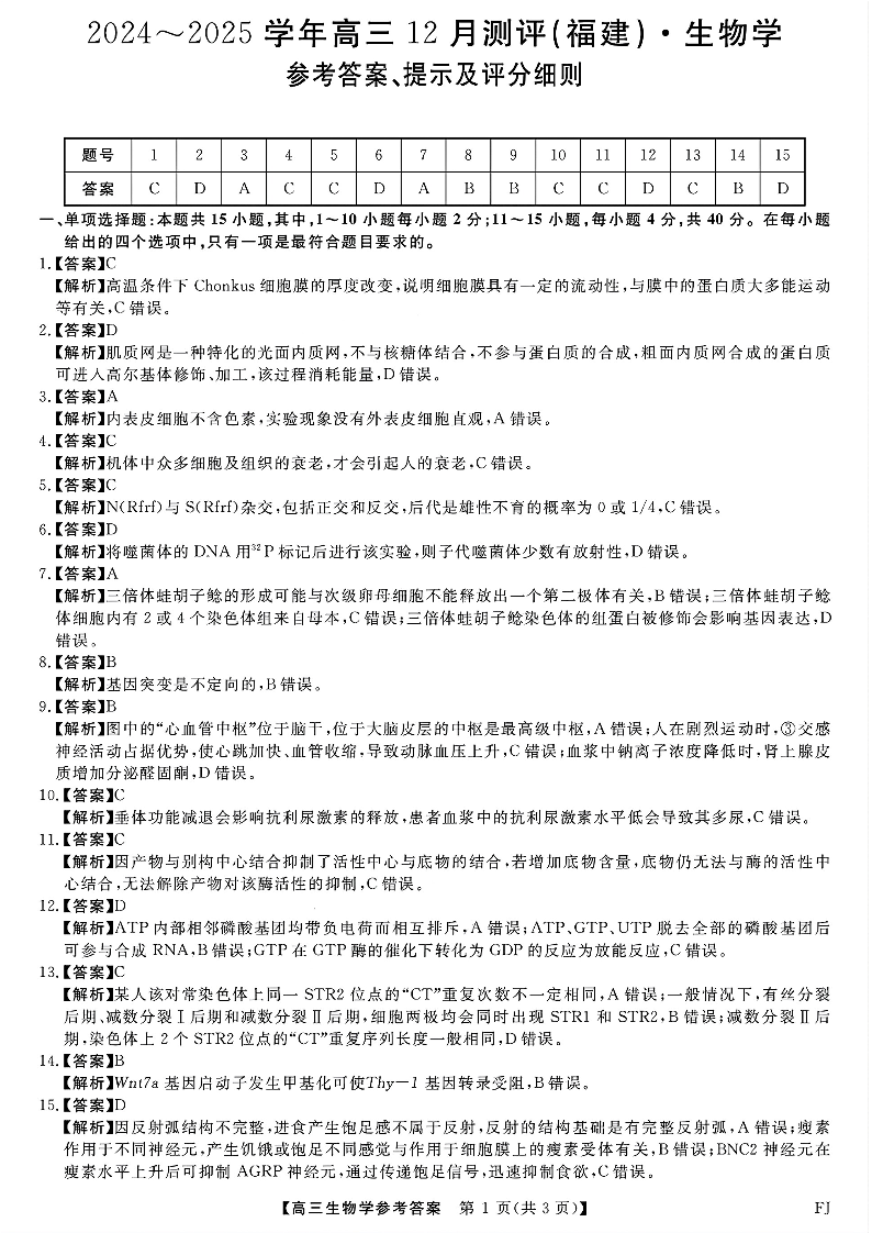 福建省金科大联考2025届上学期高三年级12月测评生物答案