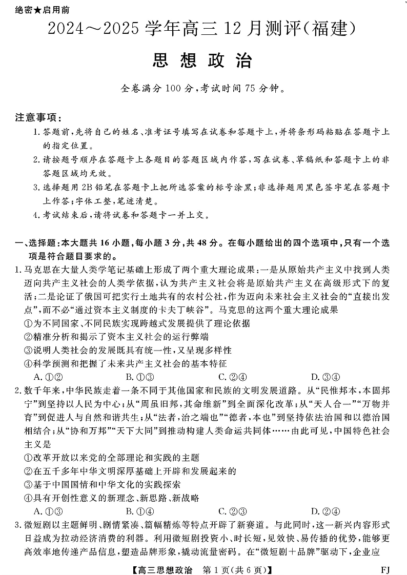 福建省金科大联考2025届上学期高三年级12月测评政治