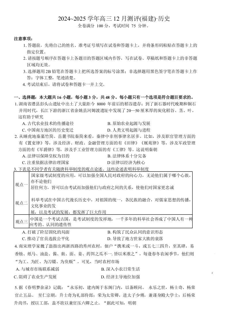 福建省金科大联考2025届上学期高三年级12月测评历史+答案