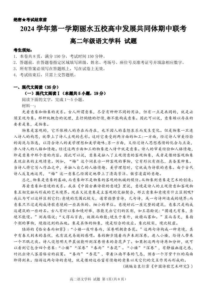 浙江省丽水五校高中发展共同体2024-2025学年上高二期中联考语文