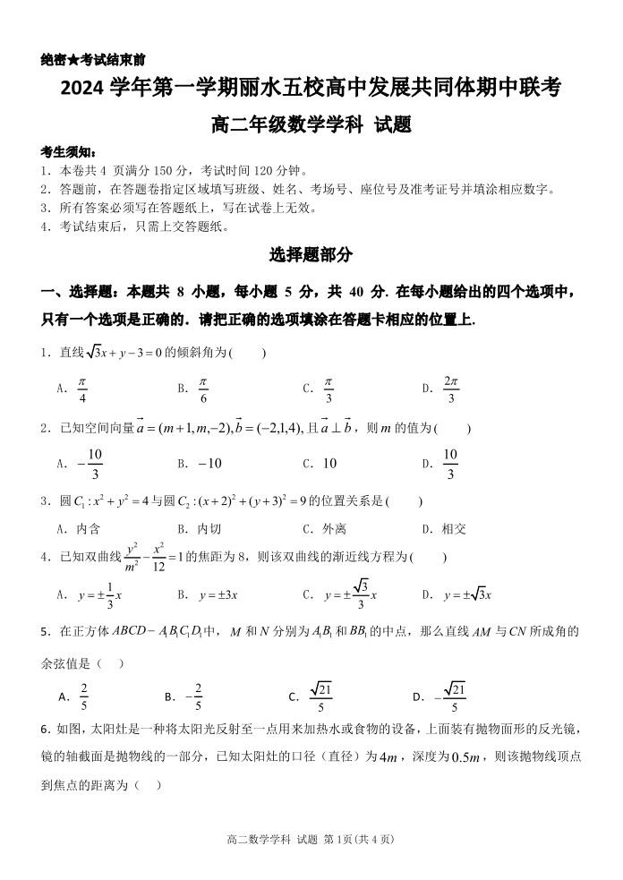 浙江省丽水五校高中发展共同体2024-2025学年上高二期中联考数学