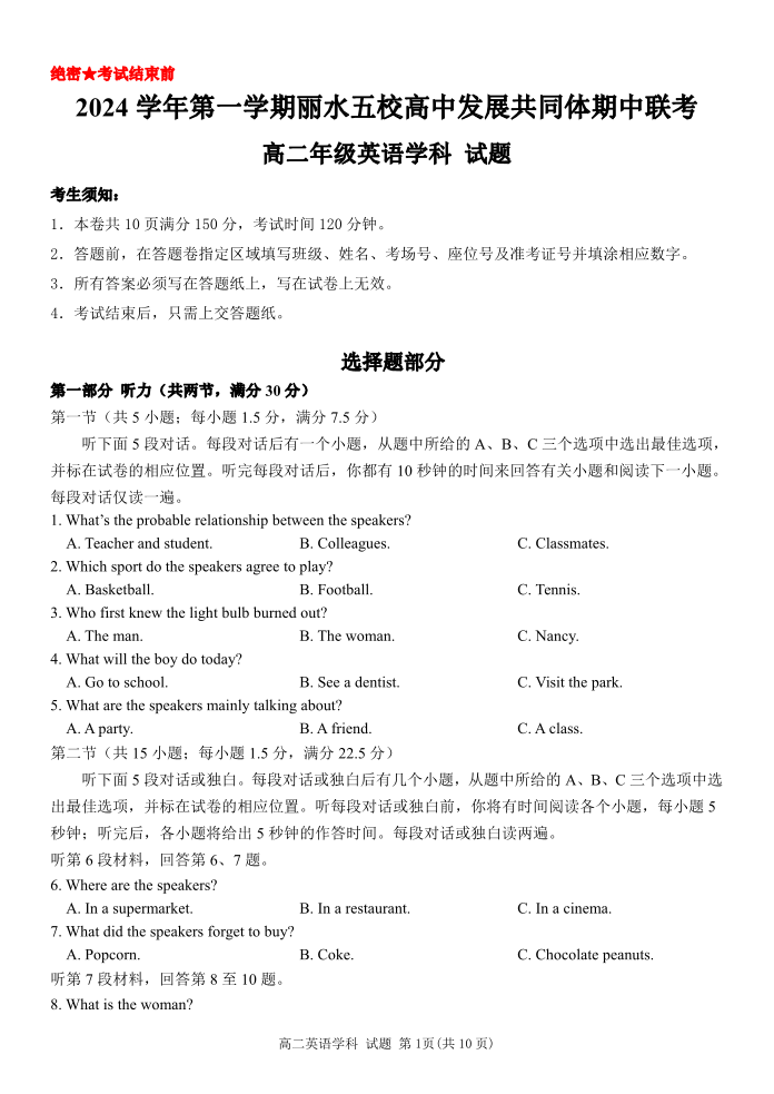 浙江省丽水五校高中发展共同体2024-2025学年上高二期中联考英语