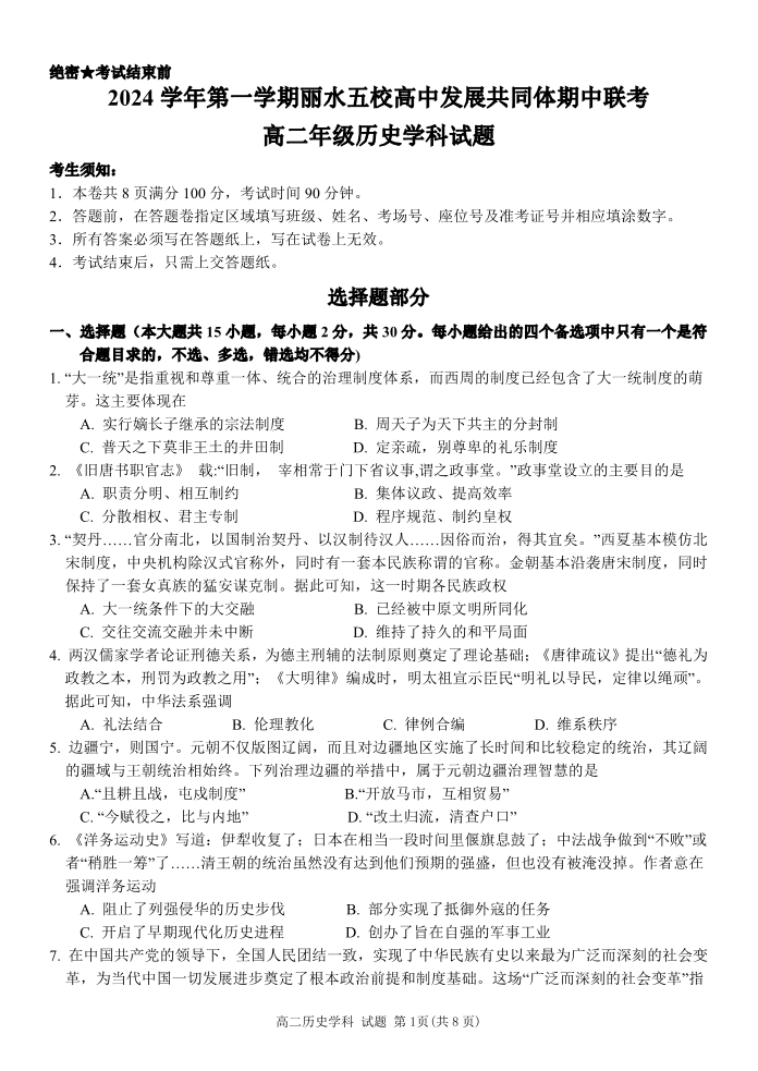 浙江省丽水五校高中发展共同体2024-2025学年上高二期中联考历史