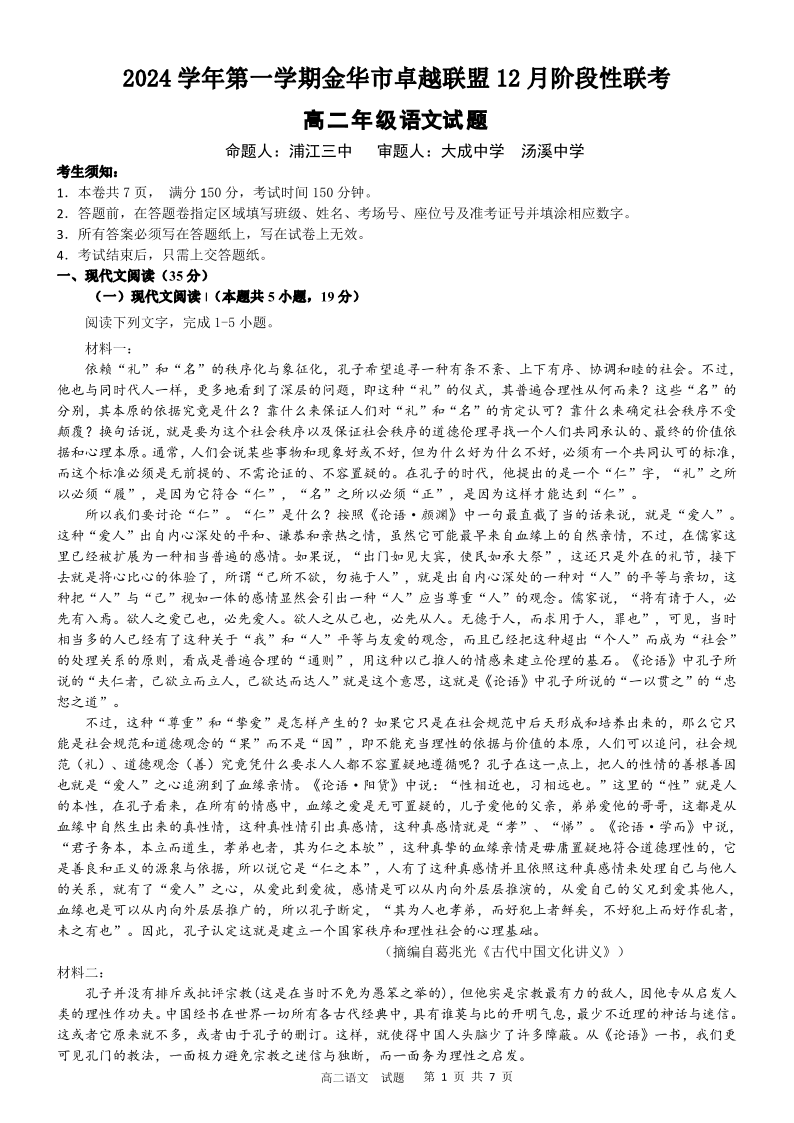 浙江省金华市卓越联盟2024-2025学年高二12月阶段性联考语文
