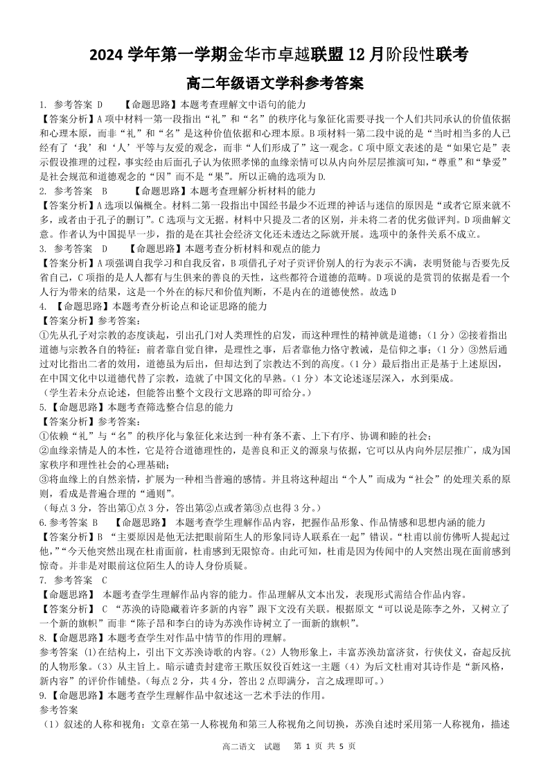 浙江省金华市卓越联盟2024-2025学年高二12月阶段性联考语文答案